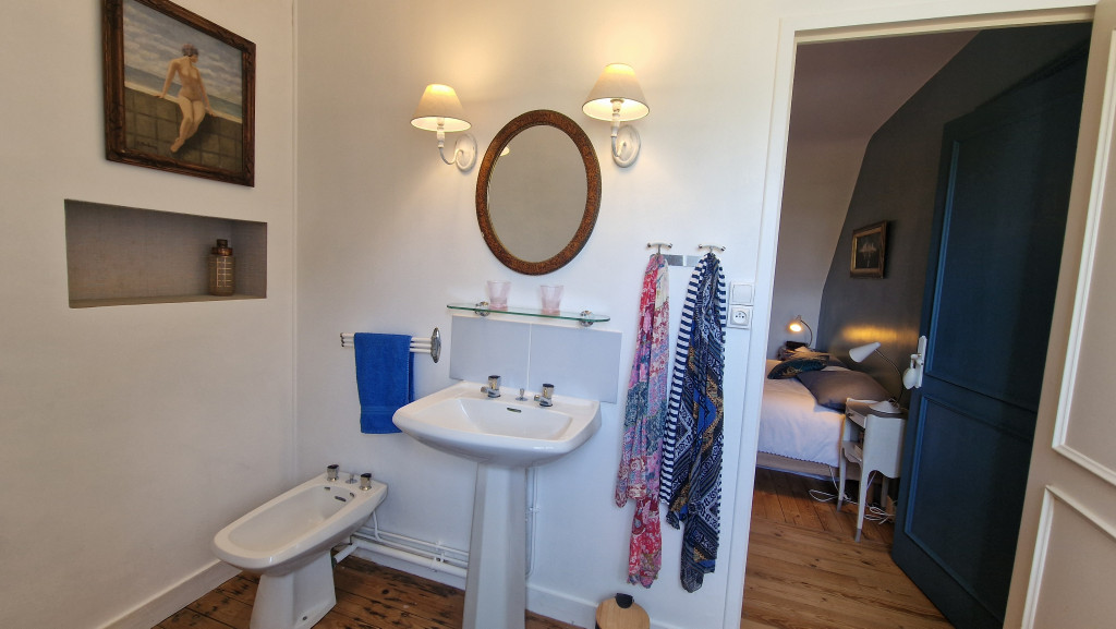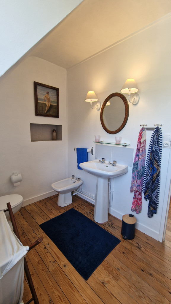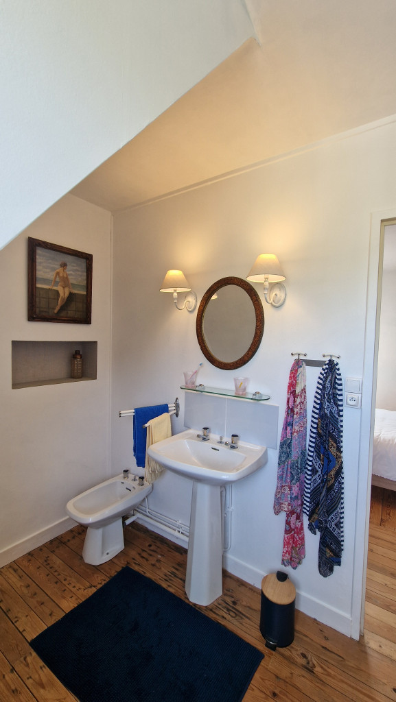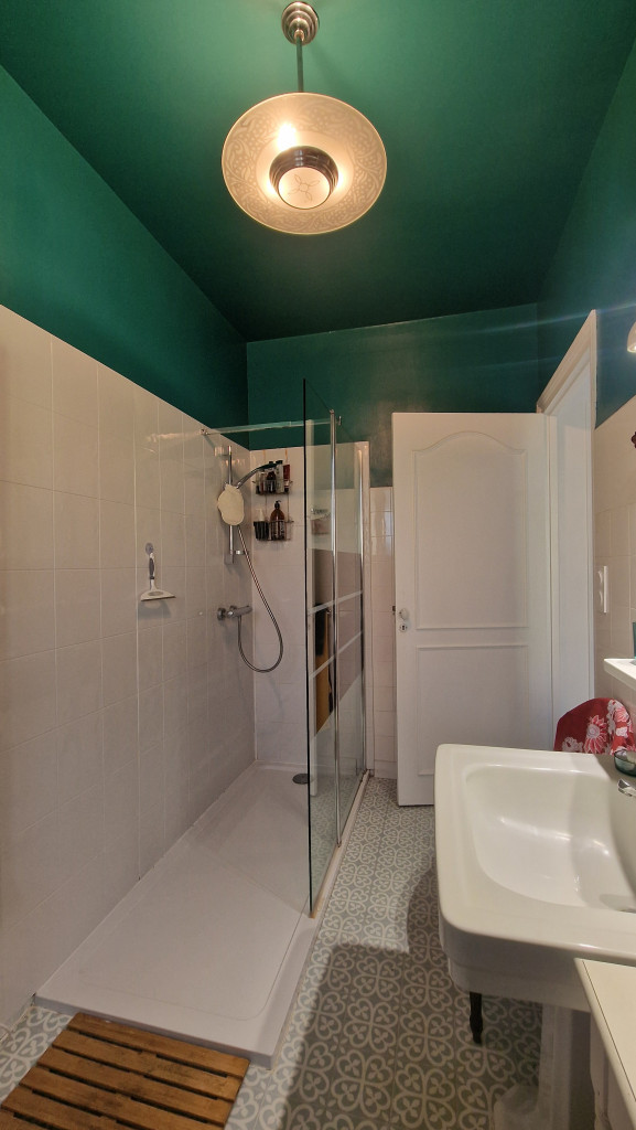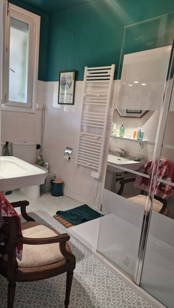 Toujours au rez-de-chaussée vous disposez d’une salle de bain avec douche à l’italienne, une vasque et un WC.