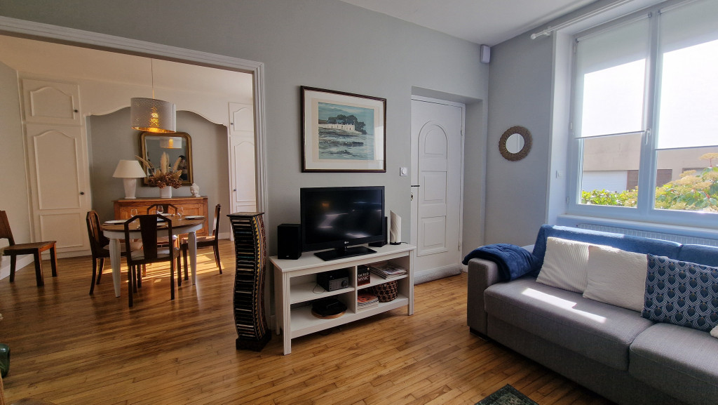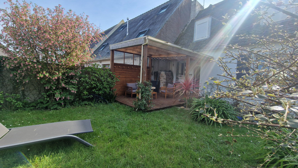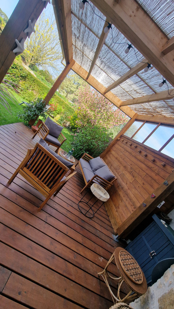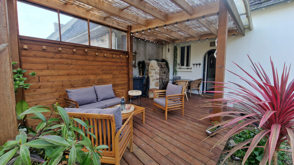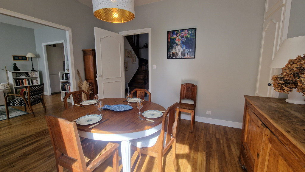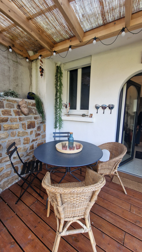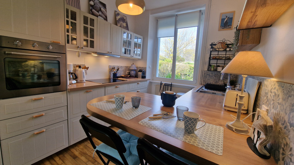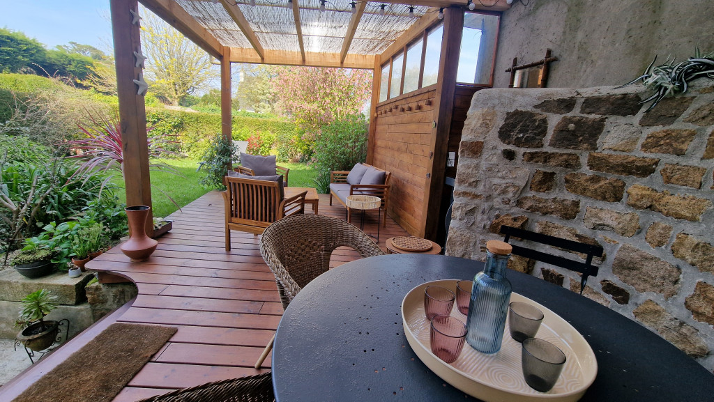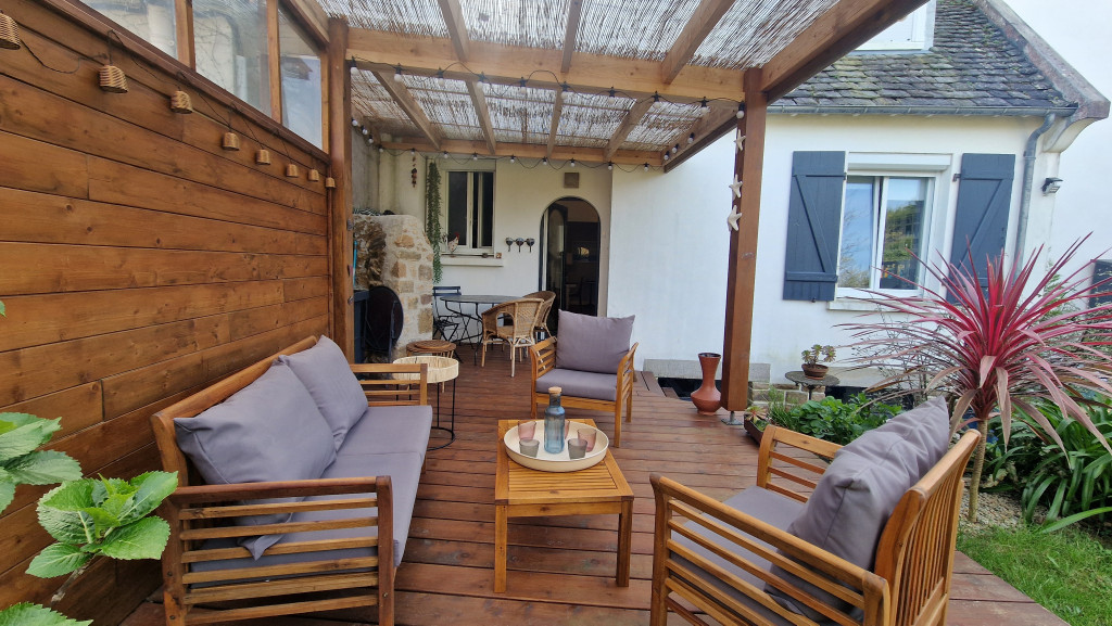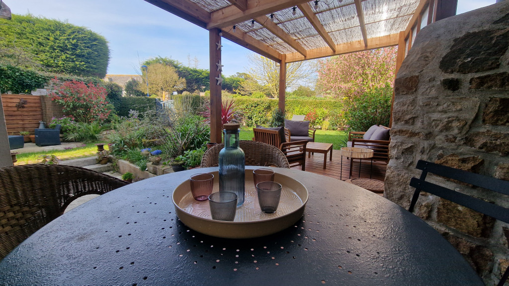 Le rez-de-chaussée de la maison propose un bel espace à vivre, lumineux, avec un séjour et ses canapés confortables, une salle à manger pour des repas entre amis ou en famille et une cuisine ouverte tout équipée avec un mange-debout pour le petit déjeuner. La terrasse, accessible depuis l’entrée est équipée d’un salon de jardin, de transats. Depuis la terrasse, vous pouvez accéder au petit jardin arboré et fleuri, à l’abri des regards et du bruit.