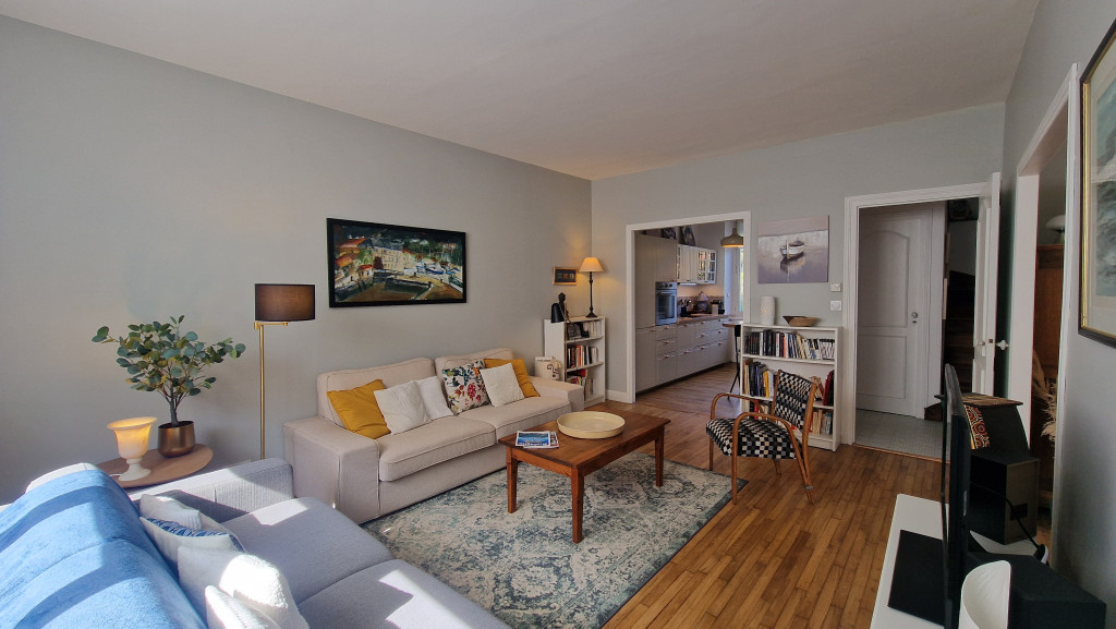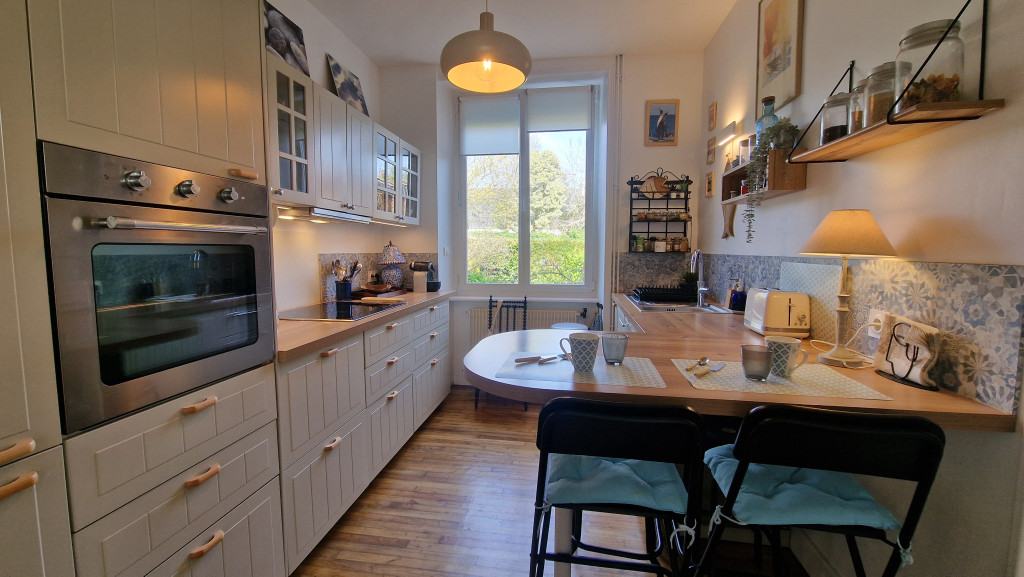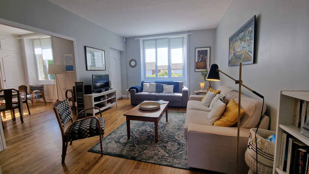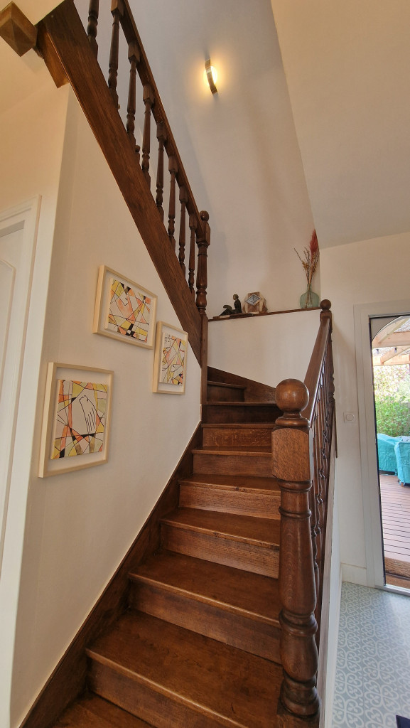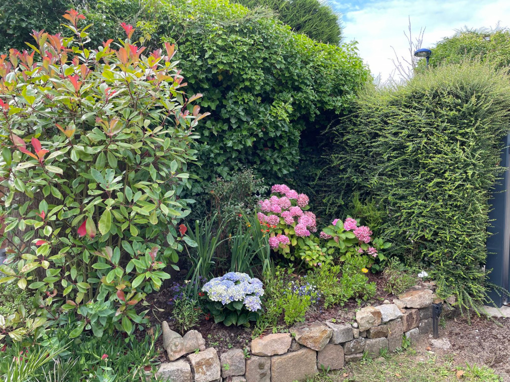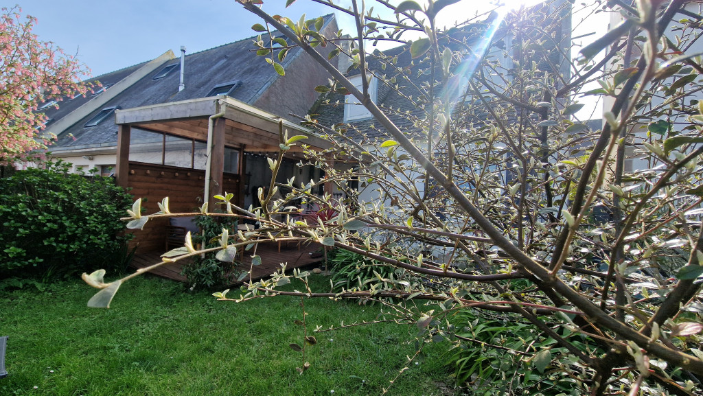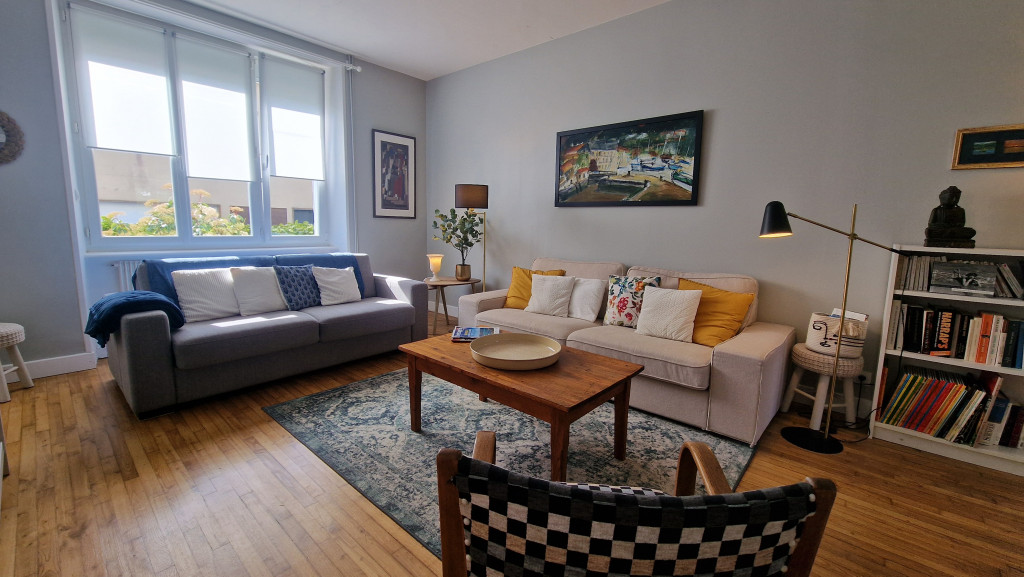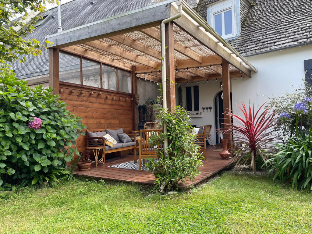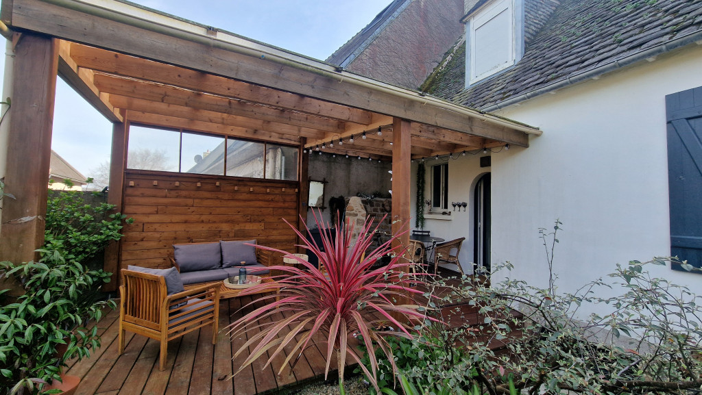 Le rez-de-chaussée de la maison propose un bel espace à vivre, lumineux, avec un séjour et ses canapés confortables, une salle à manger pour des repas entre amis ou en famille et une cuisine ouverte tout équipée avec un mange-debout pour le petit déjeuner. La terrasse, accessible depuis l’entrée est équipée d’un salon de jardin, de transats. Depuis la terrasse, vous pouvez accéder au petit jardin arboré et fleuri, à l’abri des regards et du bruit.