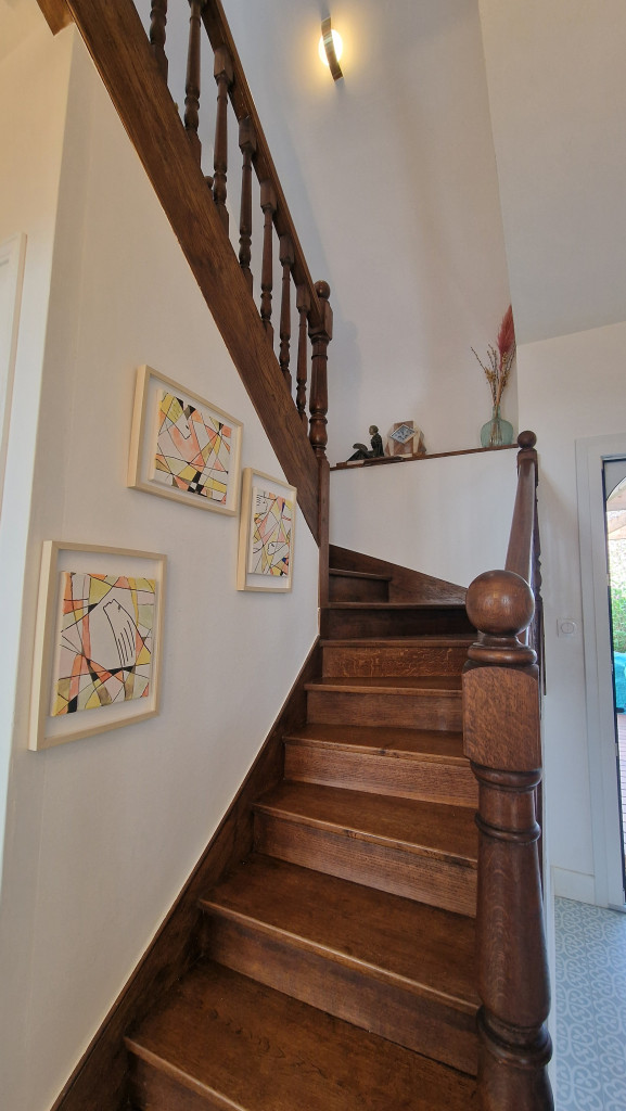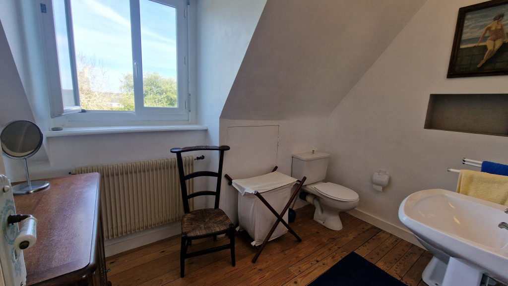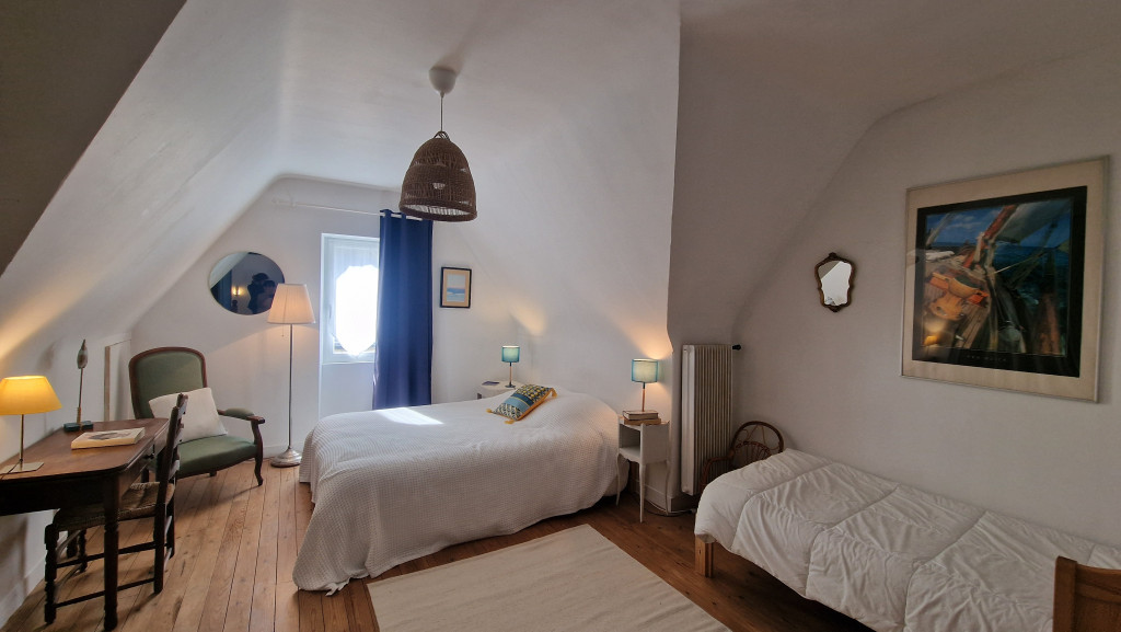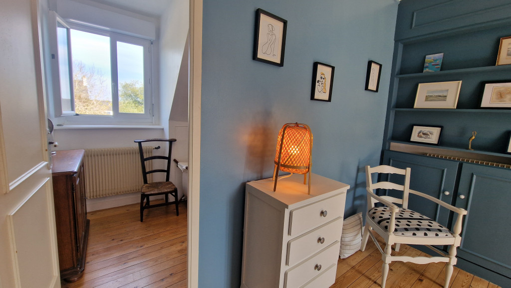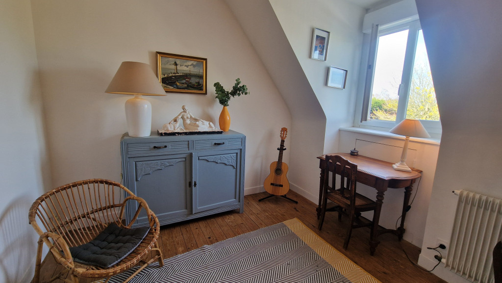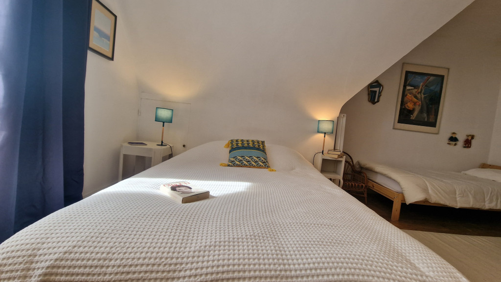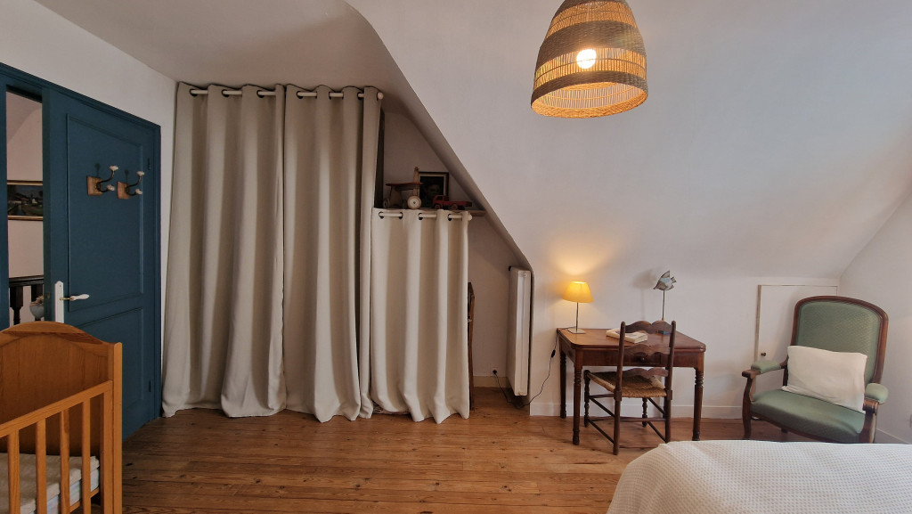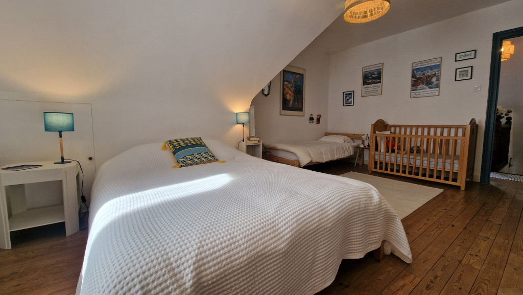 Au premier étage, la maison propose une chambre avec un lit double (160 cm) et une salle de bain attenante avec vasque et WC, une deuxième chambre avec un lit double (140 cm) , un lit simple (90 cm) et un lit bébé, penderie. sur le palier vous disposez d’un espace bureau ouvert.
