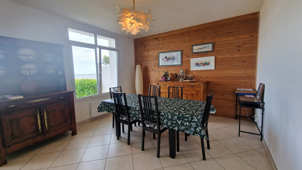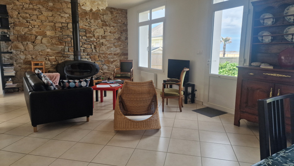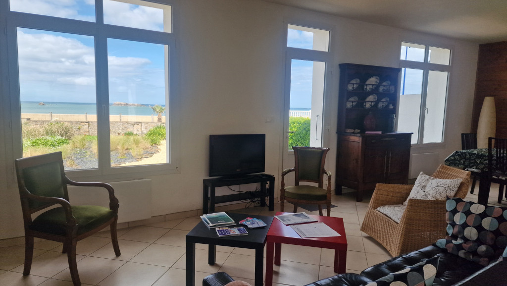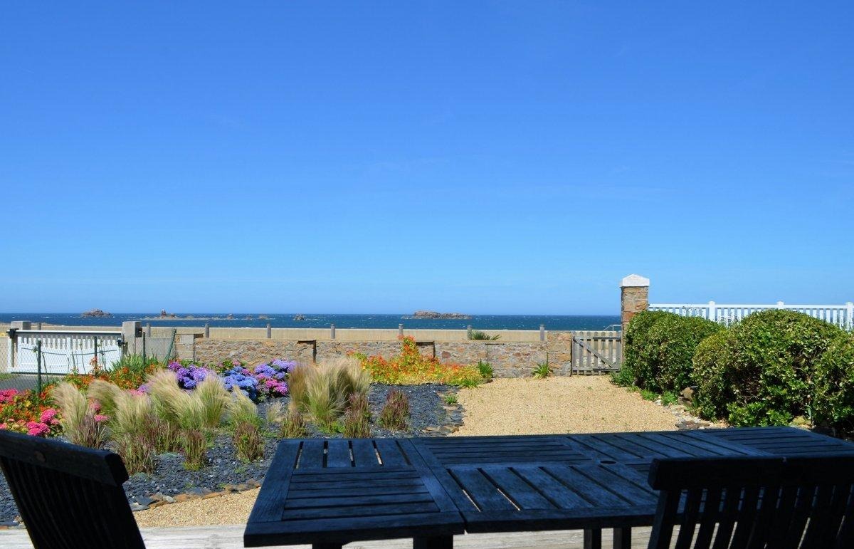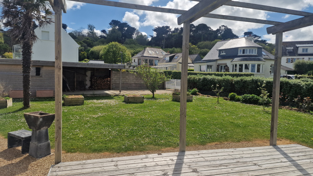 Le rez-de-chaussée de la maison propose un bel espace à vivre, lumineux, avec un séjour et ses canapés confortables, une salle à manger pour des repas en famille et une cuisine ouverte tout équipée . La terrasse, accessible depuis la cuisine est équipée d’un salon de jardin. Depuis la terrasse, vous pouvez accéder au petit jardin arboré et fleuri, à l’abri des regards et du bruit. Face à la mer une autre terrasse vous attend pour profiter de merveilleux couchers de soleil.