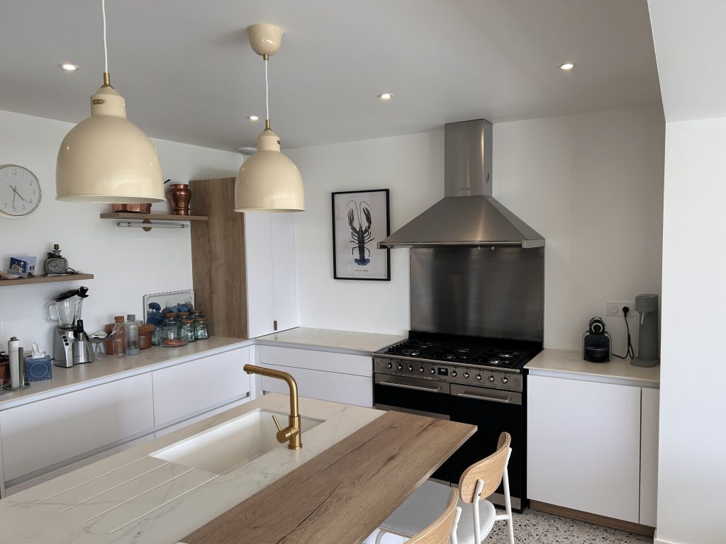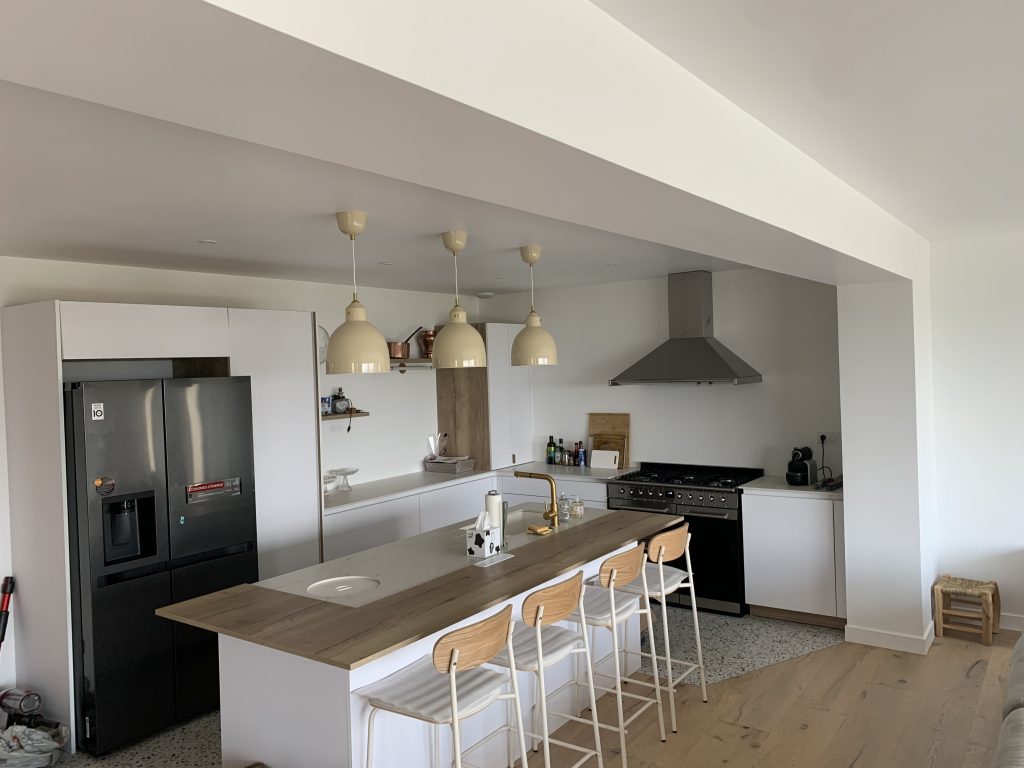 Le rez-de-chaussée de la maison propose une grande pièce de vie, très lumineuse grâce à sa grande baie vitrée, avec un séjour et ses canapés confortables sur lesquels vous pourrez admirer la vue, une salle à manger avec une grande table conviviale pour des repas entre amis ou en famille et une cuisine ouverte tout équipée avec un îlot central. Dans un coin de la pièce, vous trouverez une cheminée à bois fermée qui vous permettra de passer un moment au coin du feu….La terrasse, accessible depuis la grande pièce de vie est équipée d’un salon de jardin, de transats et d’une plancha. Depuis la terrasse, vous pouvez accéder au jardin arboré et fleuri.