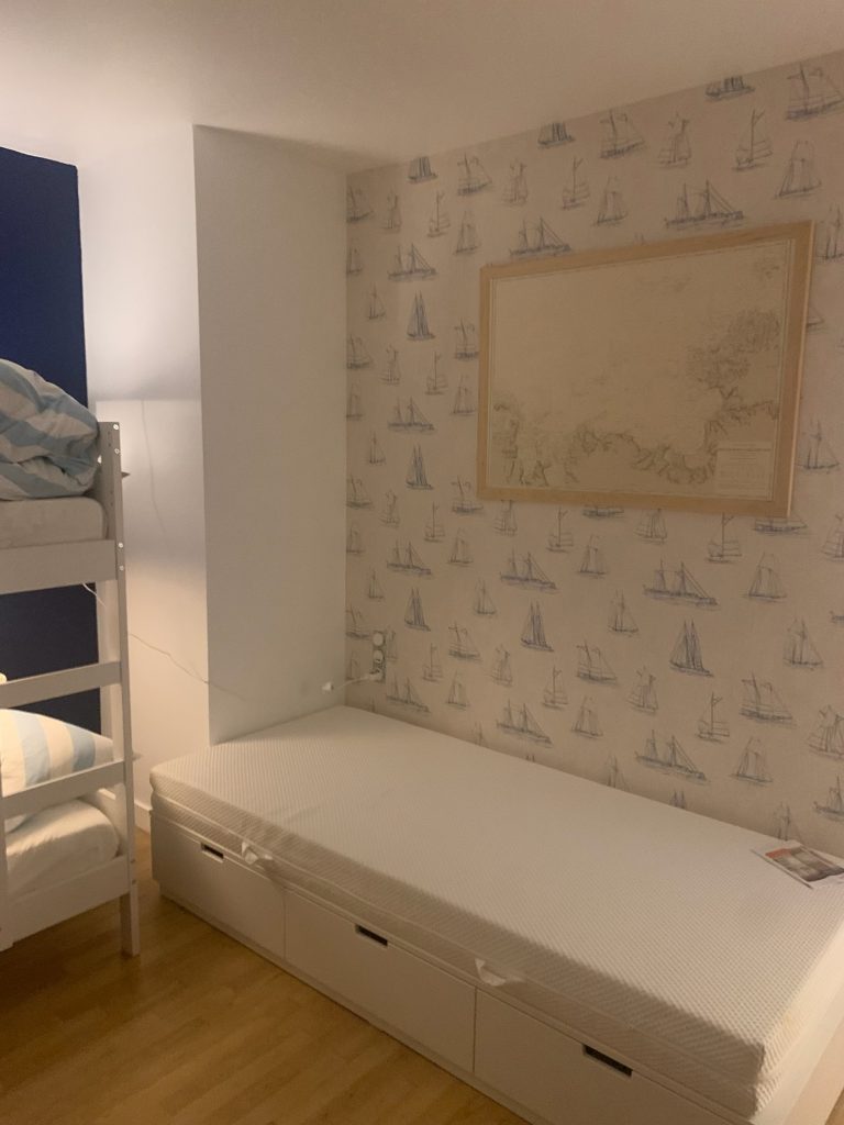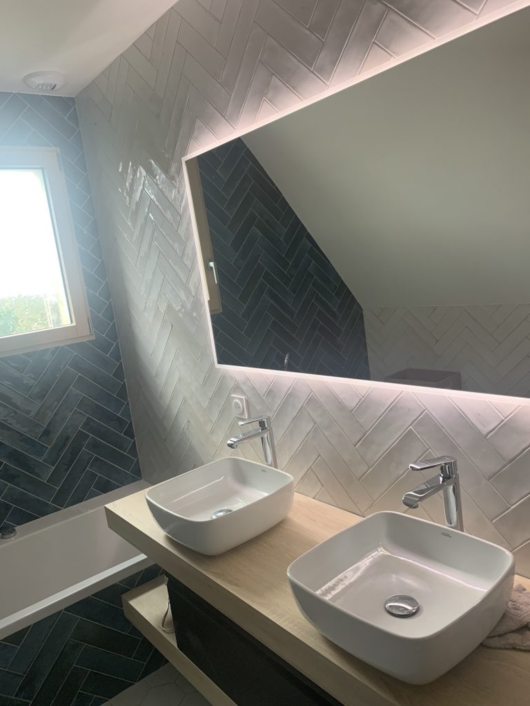 Au premier étage, la maison propose une chambre avec un lit double (180 cm) et une salle de bain attenante avec douche italienne et WC, une deuxième chambre avec un lit double (160 cm) et une dernière chambre appelée « dortoir » pour les enfants avec 3 lits simples (90 cm) et enfin une salle de bain indépendante avec baignoire, deux vasques et un WC.