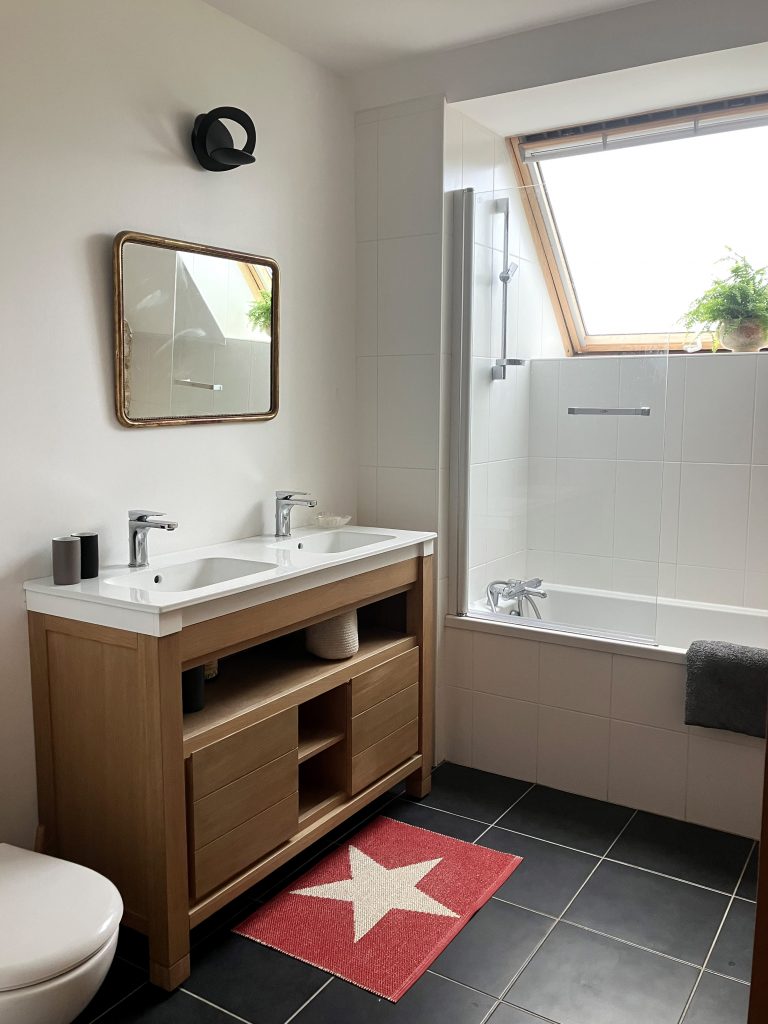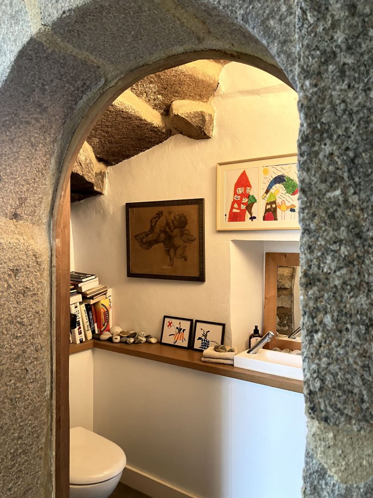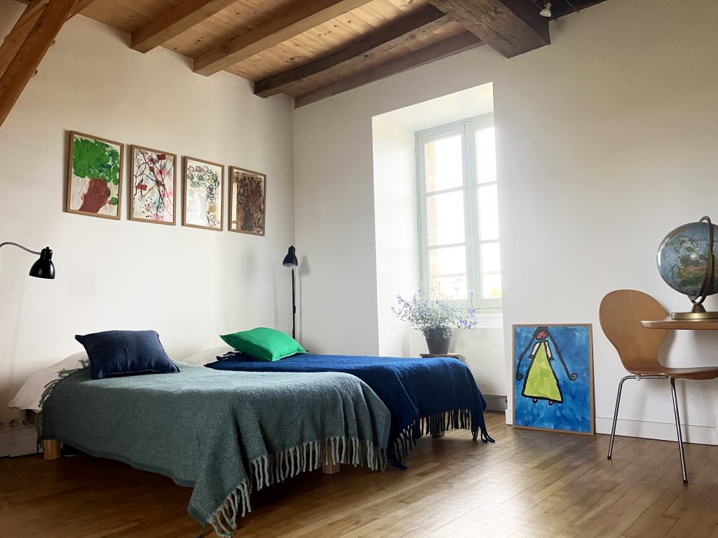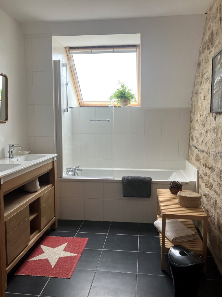 Vous accédez à l’étage par un magnifique escalier en pierre. Le premier étage comprend trois chambres et une salle de bain : une chambre avec un lit double (160 cm) qui possède son cabinet de toilette, une chambre avec deux lits simples (90 cm), une chambre avec un lit double (160 cm) et enfin une confortable salle de bain avec baignoire et WC.